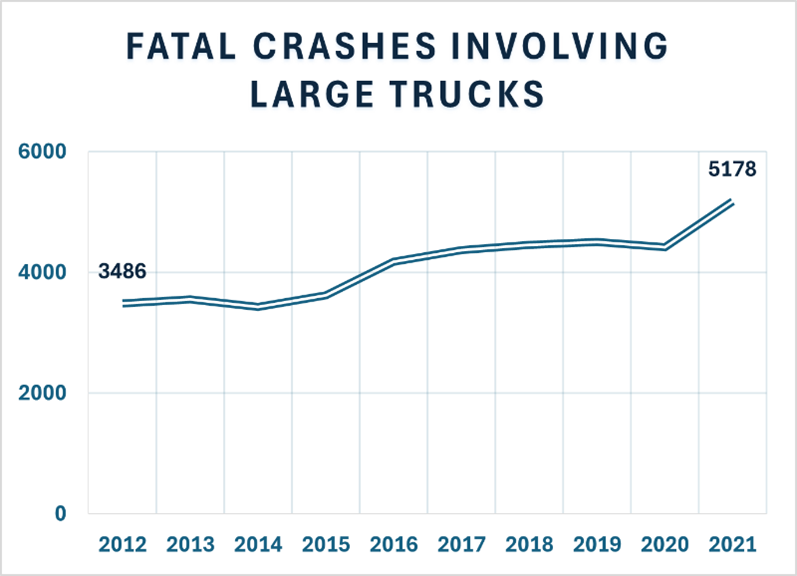 The number of people in the United States who were killed in large truck wrecks rose, higher and morbidly higher, between 2012 and 2021. Within a decade, the yearly death toll rose from 3,944 in 2012 to 5,788 in 2021.